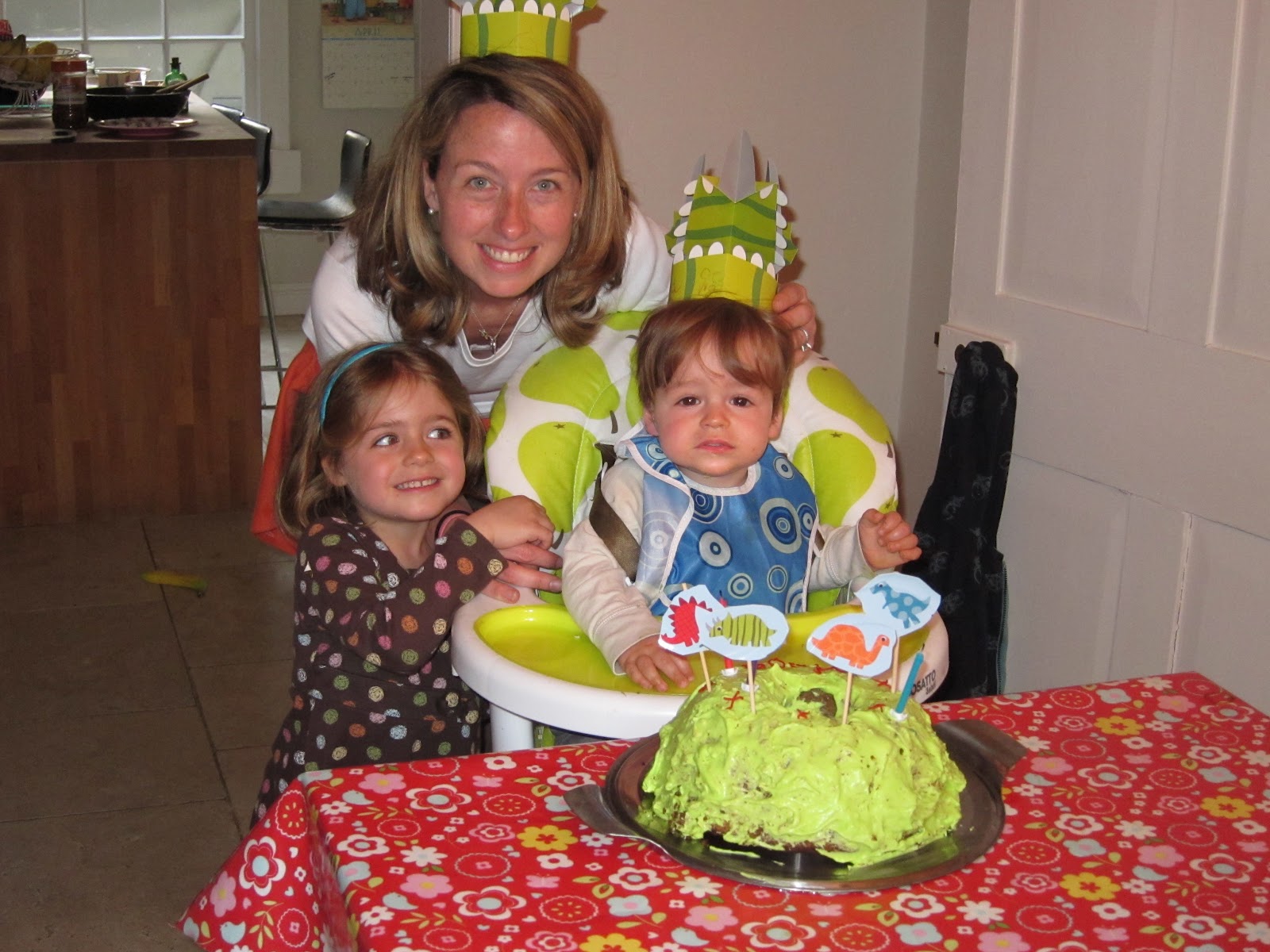 SO it was on to Plan B: Dinosaurs! But I had already bought everything for the monkey-banana cake, so that stayed in place, along with an attempted "jungle" icing that from the pix I posted on Facebook everyone thought was guacamole.